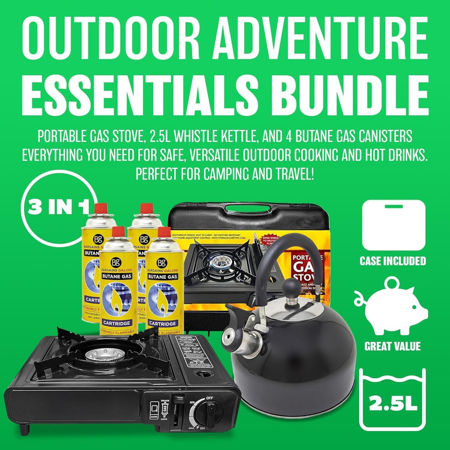 3 In 1 Camping Starter Kit – Includes Gas Stove, 4 Gas Bottles & 2.5L Kettle | Premium Burner, Automatic Ignition & Heat Control | Suitable for Fishing, Camping & Hiking | Lightweight, Essentials