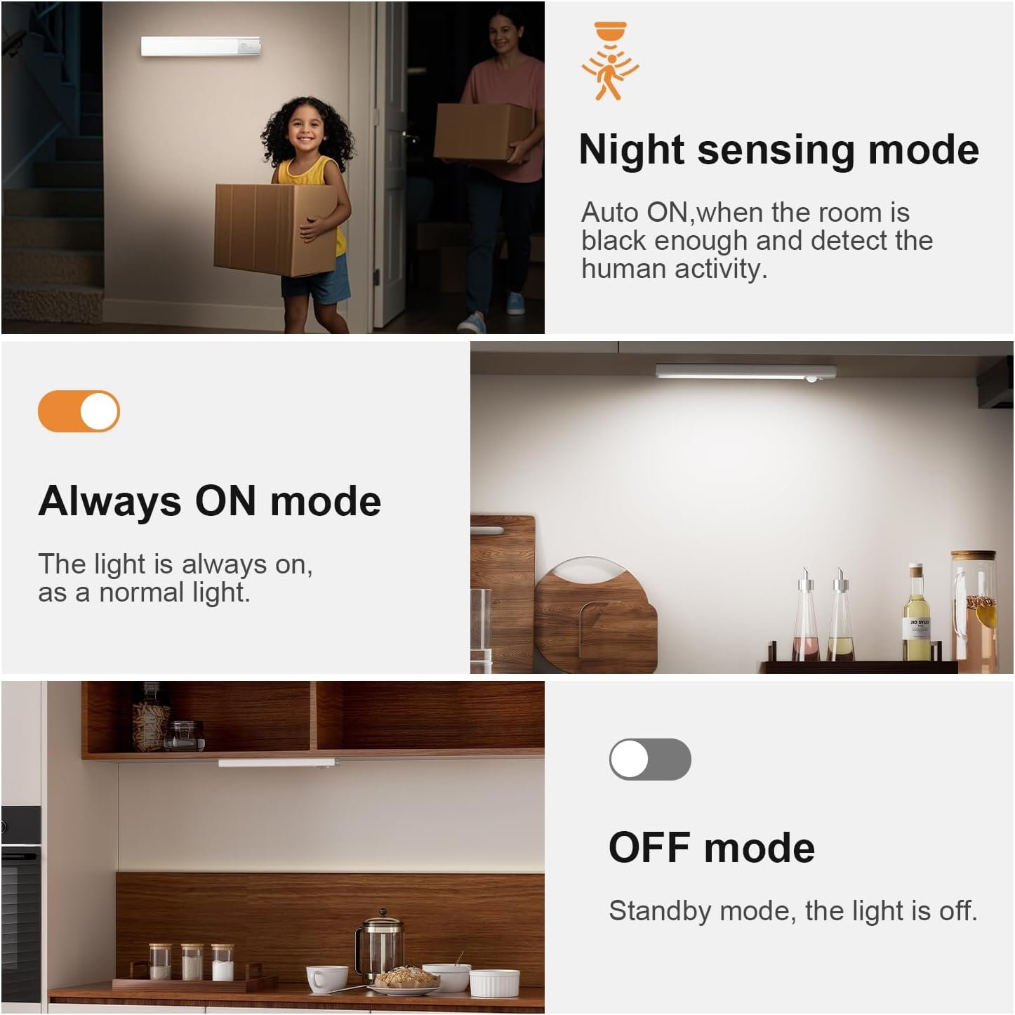 The 5 Pack Rechargeable Under Cupboard Kitchen Lights are designed to enhance your indoor lighting experience. These LED motion sensor lights are perfect for various spaces, including shelves, stairs, wardrobes, and closets. The lights are rechargeable via USB-C, making them convenient and easy to use.