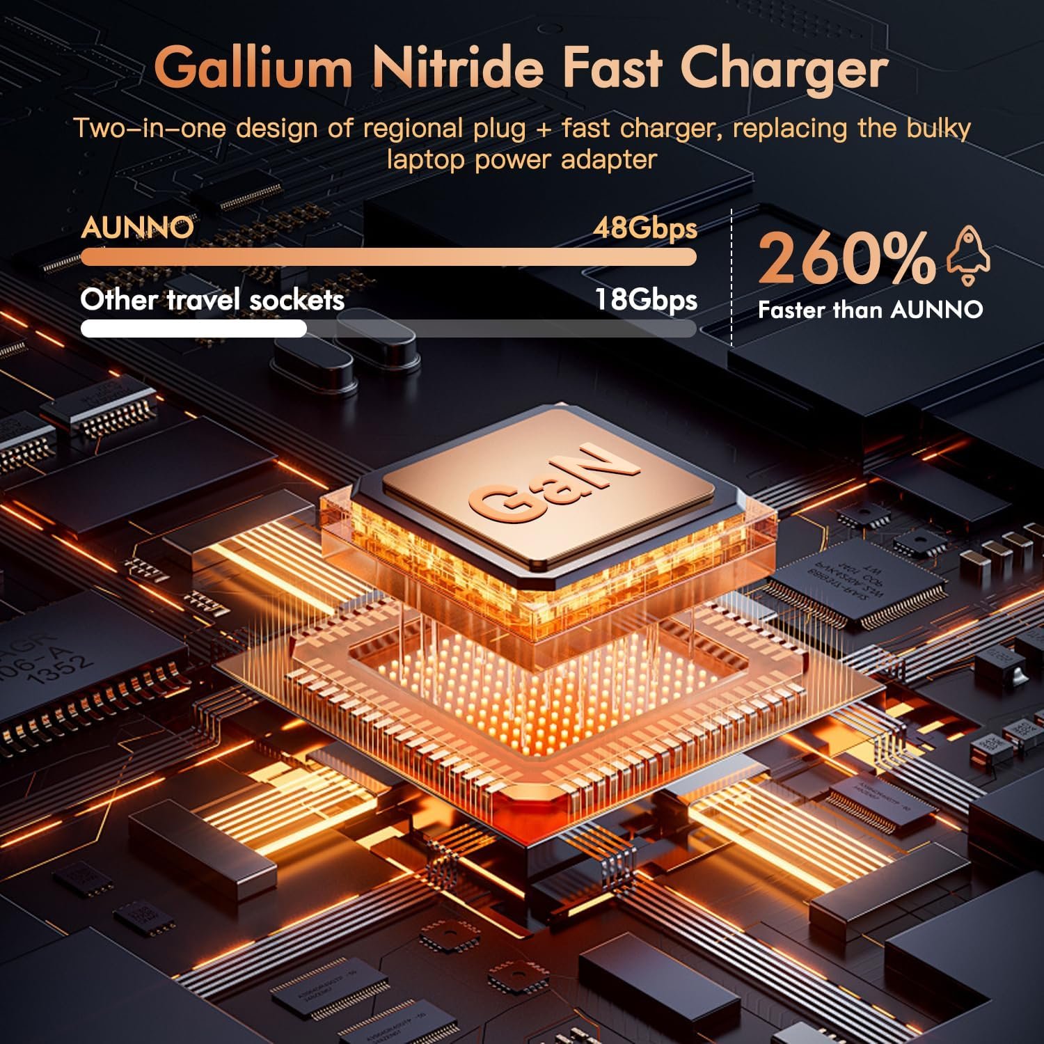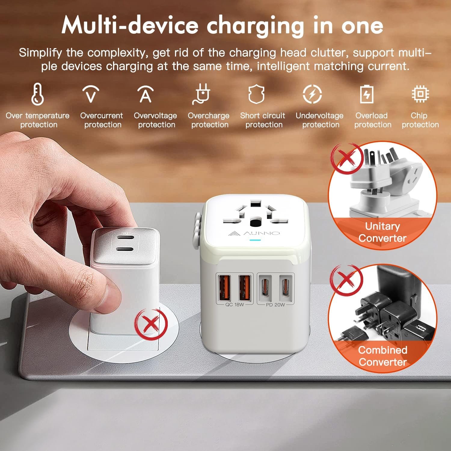 The AUNNO Universal Travel Adapter is designed for travelers seeking convenience and efficiency. This all-in-one adapter features PD 20W fast charging capabilities, ensuring your devices are powered quickly. It includes 2 USB-C and 2 USB-A ports, making it versatile for various devices. The intelligent IC chip automatically adjusts power output to protect your devices from overheating.