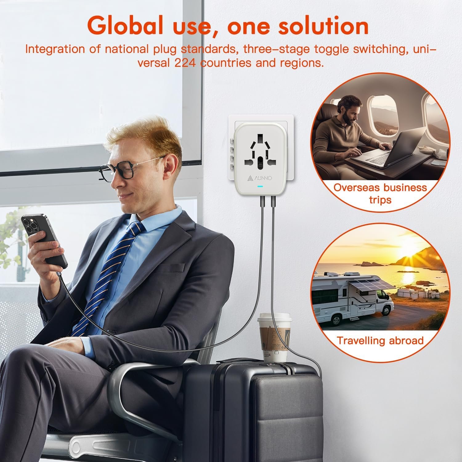 AUNNO Universal Travel Adapter, PD 20W Fast Charging Plug Adapter with 2 USB-C and 2 USB-A Ports, All in One Travel Adapter for Europe, UK, US, Australia etc