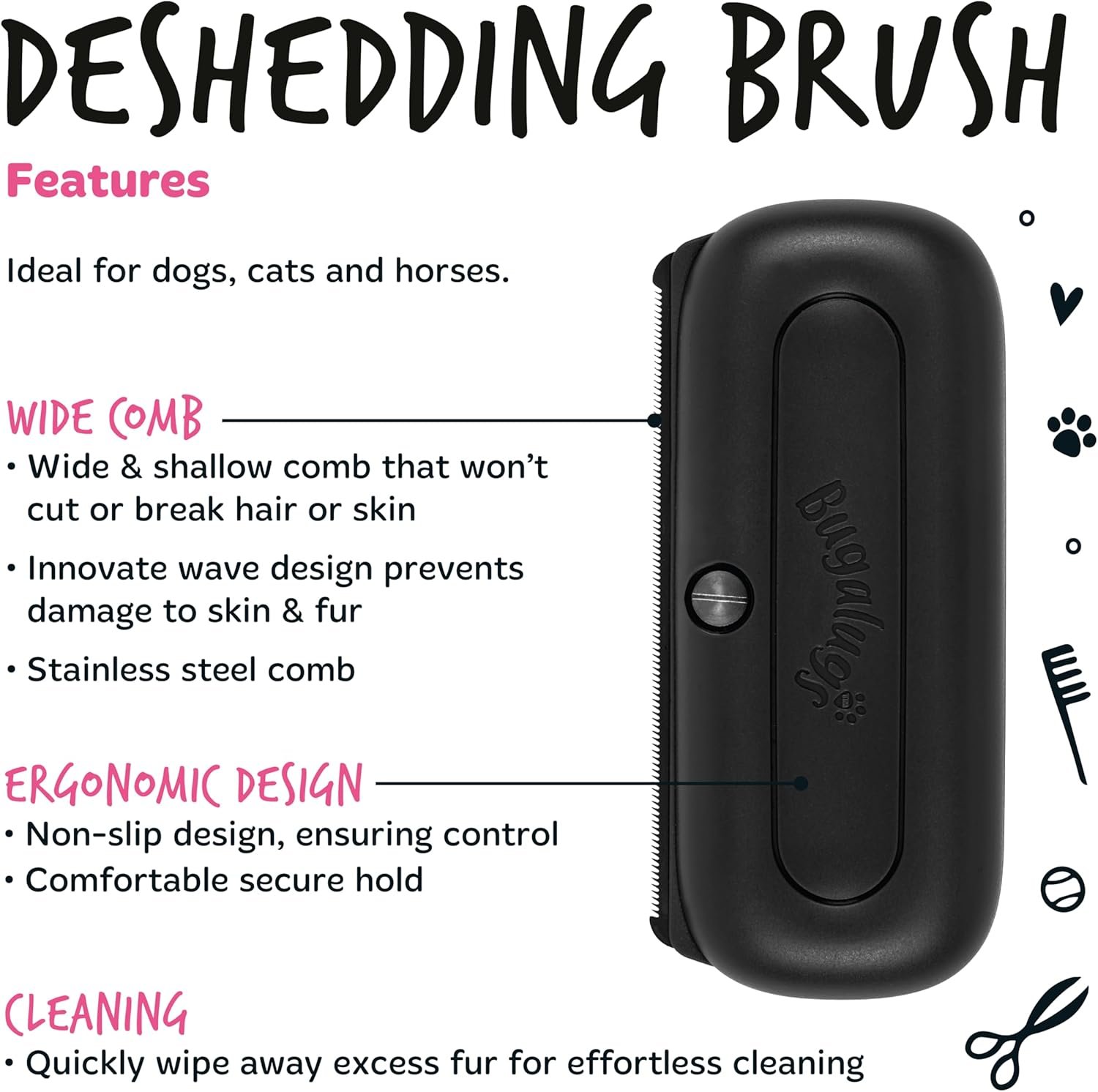 Bugalugs Deshedding Brush for Dogs, Cats, Horses – Pet Grooming Tool that is Gentle & Effective With Wide Shallow Comb, Smooth Groomer for Dog, Cat and Horse (Black)