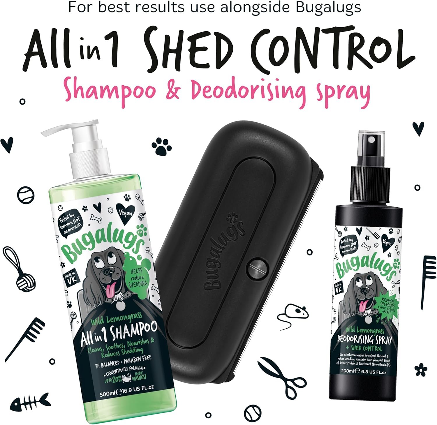 The Bugalugs Deshedding Brush is designed for effective grooming of dogs, cats, and horses. Its wide shallow comb allows for gentle removal of loose fur without irritating the skin. This grooming tool is suitable for various pet sizes and types, making it versatile for pet owners. Regular use can help reduce shedding and keep your pet's coat healthy and shiny.