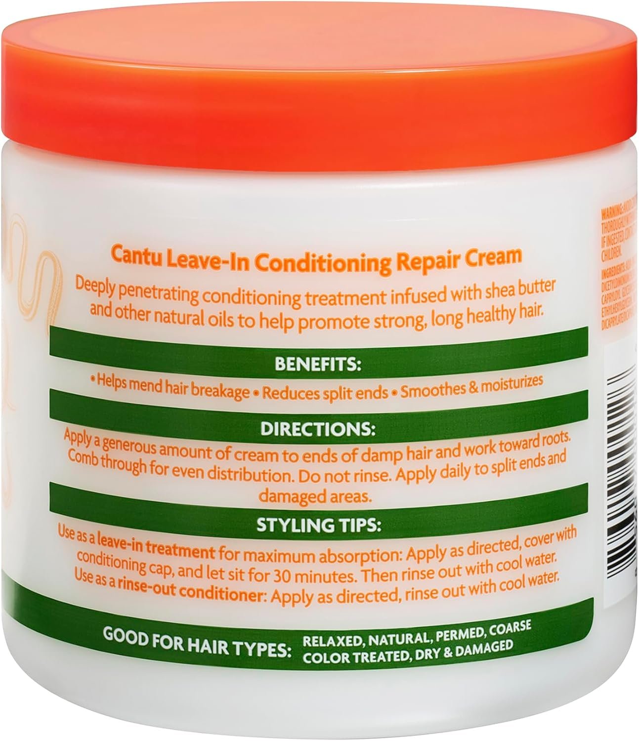 The Cantu Leave-In Conditioning Repair Cream is a deeply penetrating treatment designed to promote strong, long, and healthy hair. Infused with shea butter and natural oils, this product aims to provide essential moisture and nourishment.