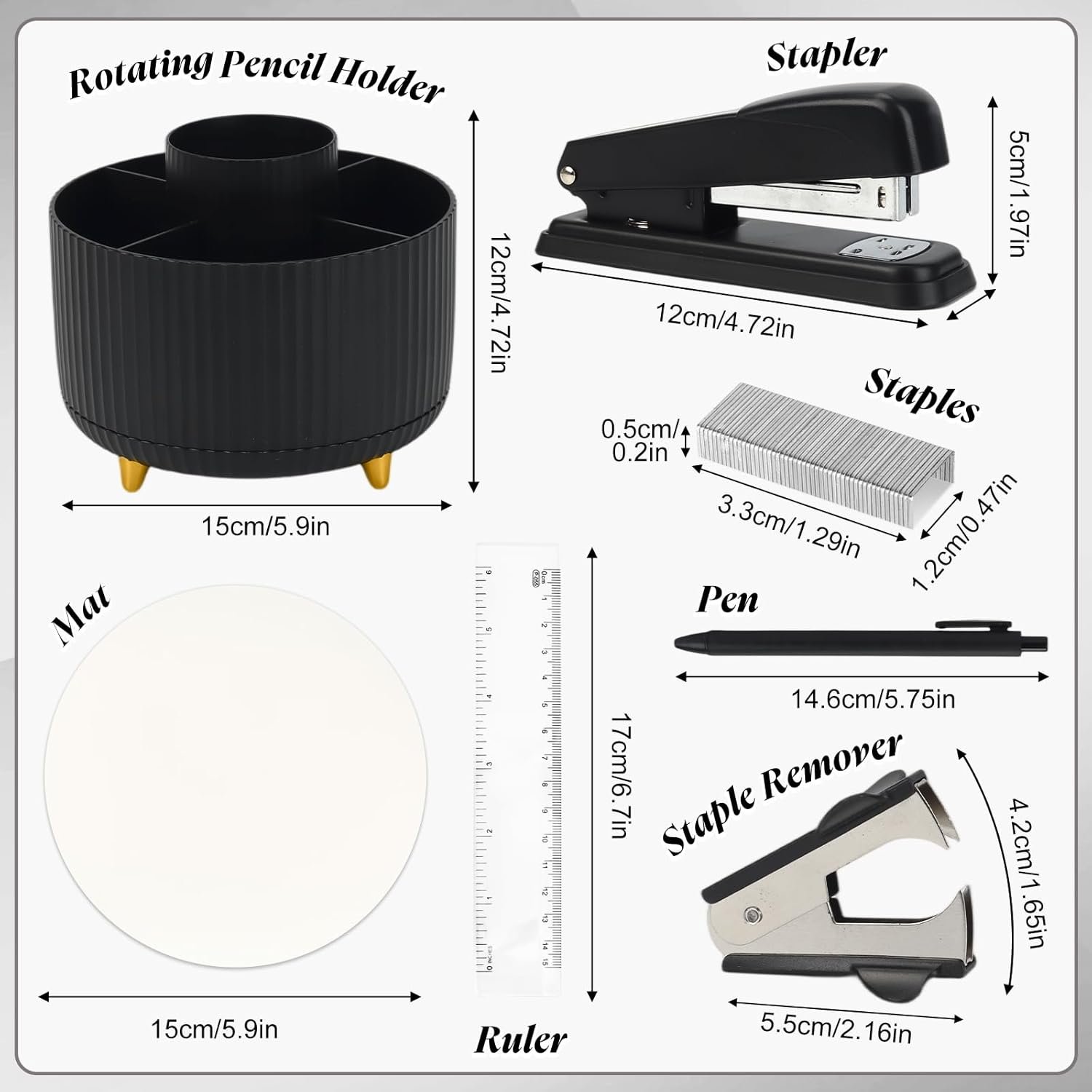 Cute Stationery Set, 13 in 1 Office Supplies & Desk Accessories for Women with Stapler & Staples Set, Pencil Holder, Tape Dispenser, Scissors, Clips, Ruler, Gift for Teachers, Students, Girls (Black)