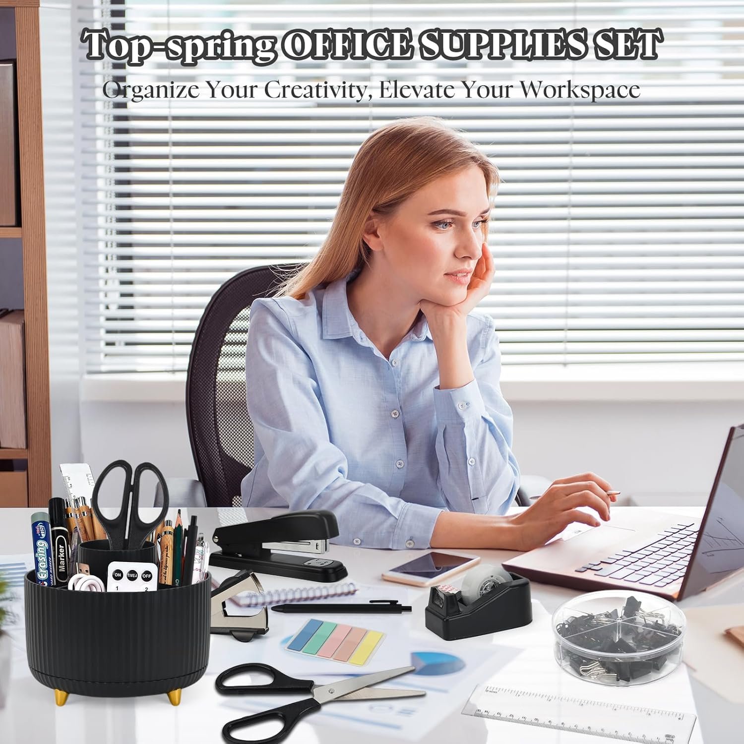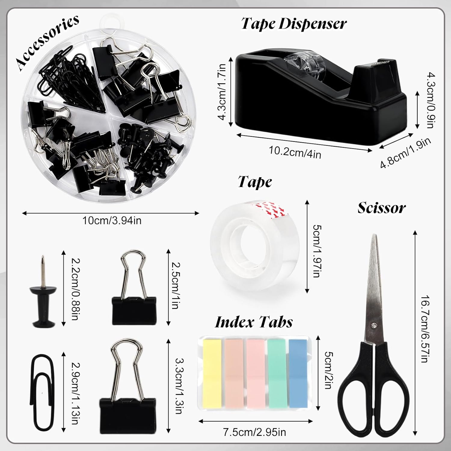 This Cute Stationery Set includes 13 essential office supplies and desk accessories, making it a perfect choice for women, teachers, and students. The set features a stapler with staples, a pencil holder, a tape dispenser, scissors, clips, and a ruler, all designed in an elegant black finish. The top-spring organizer offers five compartments to keep your workspace tidy and organized.