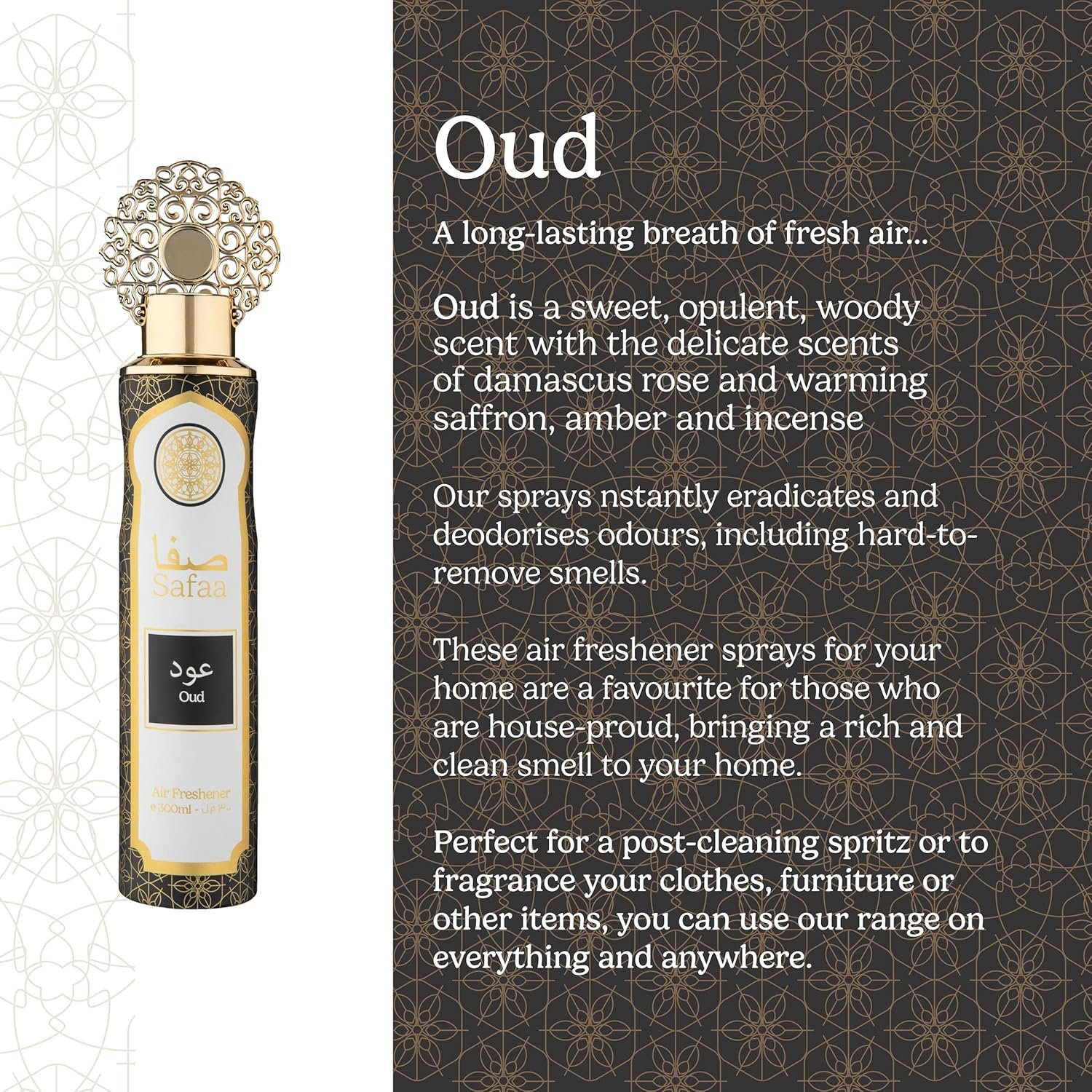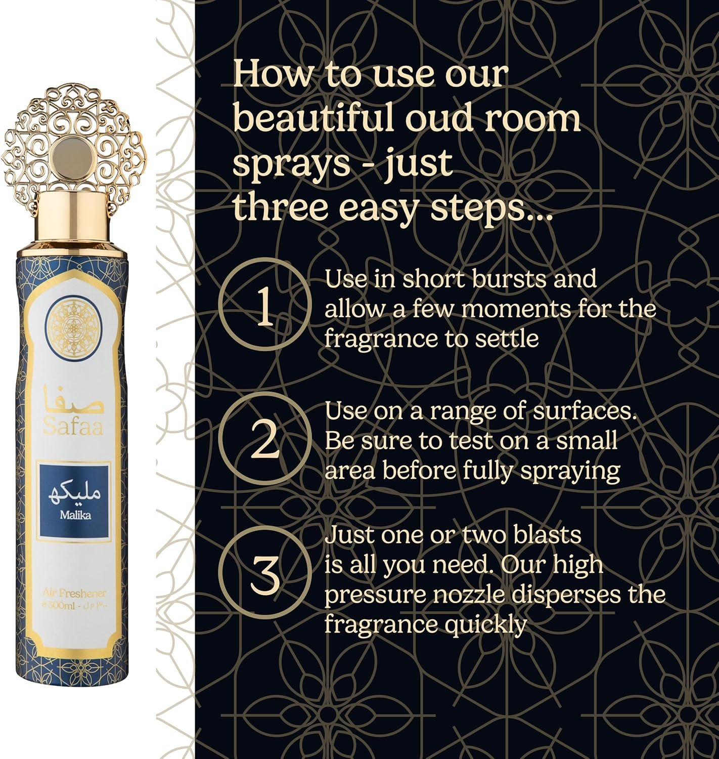 Designer Fragrances Safaa 4 Pack Exclusive Bundle – Amal, Emaan, Malika, Oud Luxury Air Freshener Cans – For Home & Vehicles – Natural Oils, Lasting Smell Spray – Deodorise & Neutralise Odours