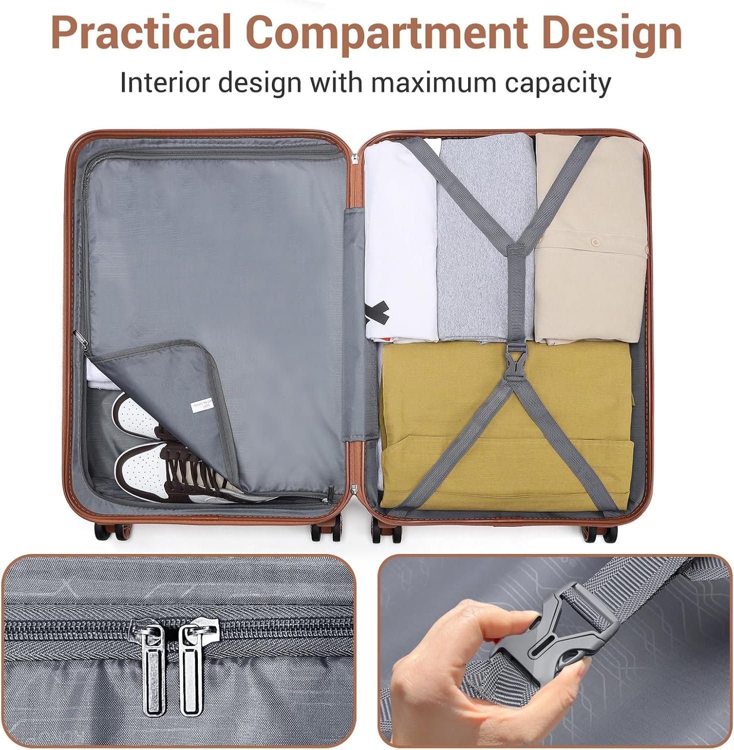 With four spinner wheels, maneuvering through busy airports or train stations is effortless. The suitcase is not only functional but also stylish, making it a great companion for any trip.