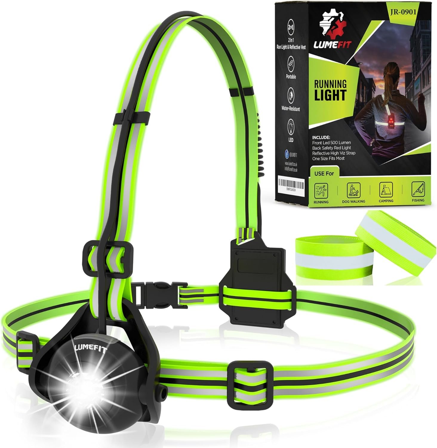The Lumefit Running Light is designed to enhance visibility for runners and outdoor enthusiasts. With a powerful 500 Lumen front LED light and a rear safety warning light, this product ensures you are seen in low-light conditions. The 90-degree adjustable beam angle allows for customizable illumination, making it suitable for various outdoor activities.