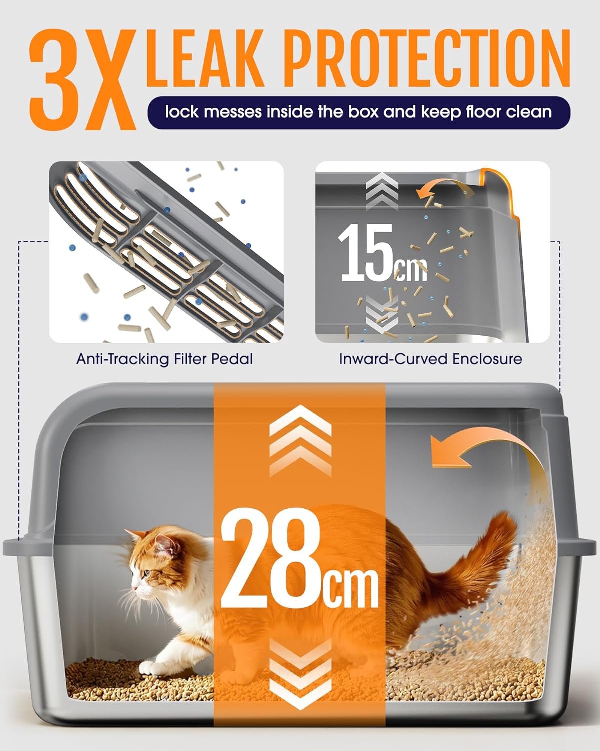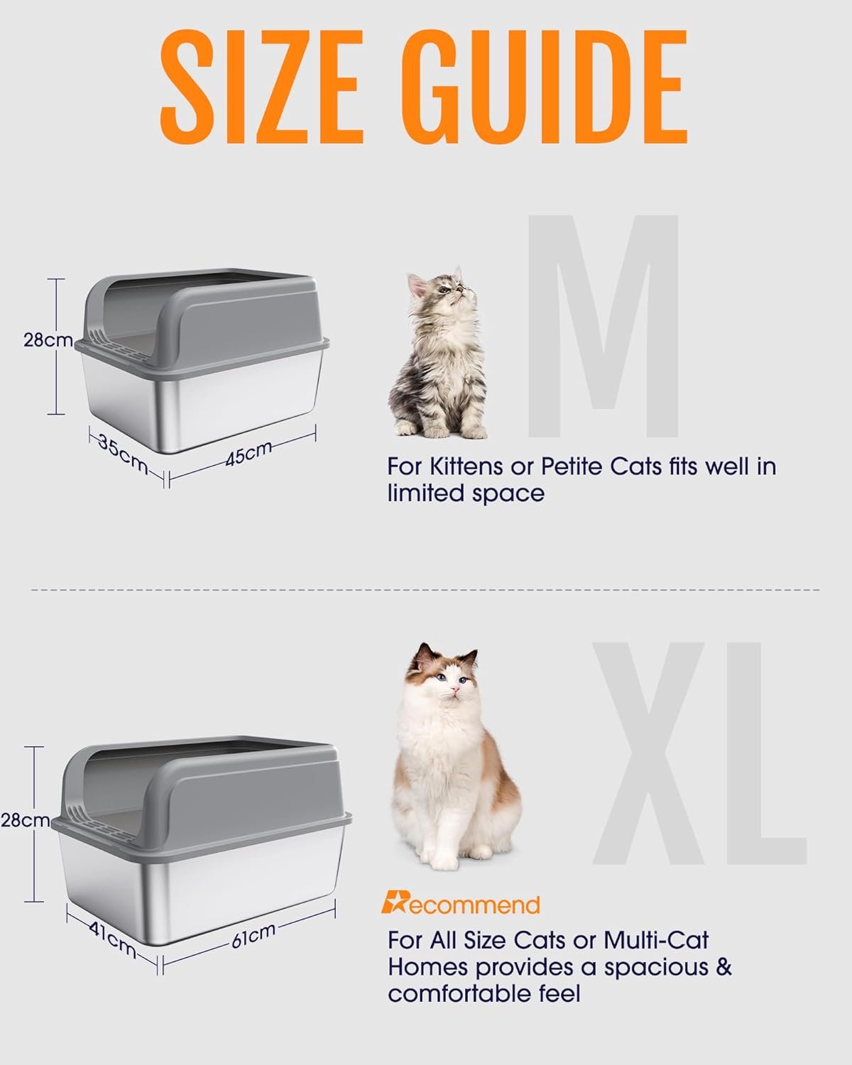 Stainless Steel Cat Litter Tray – Cat Litter Box with Removable Enclosure & Scoop, High-Sided, Non-Stick & Easy-to-Clean, Top-Entry Design, M, Grey