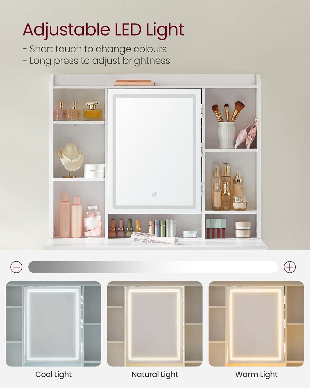 VASAGLE KAILYN Collection – Dressing Table with LED Lights, 3 Colours, Vanity Desk with Mirror, Vanity Table with 2 Drawers, Makeup Desk, Modern, White RDT123W01