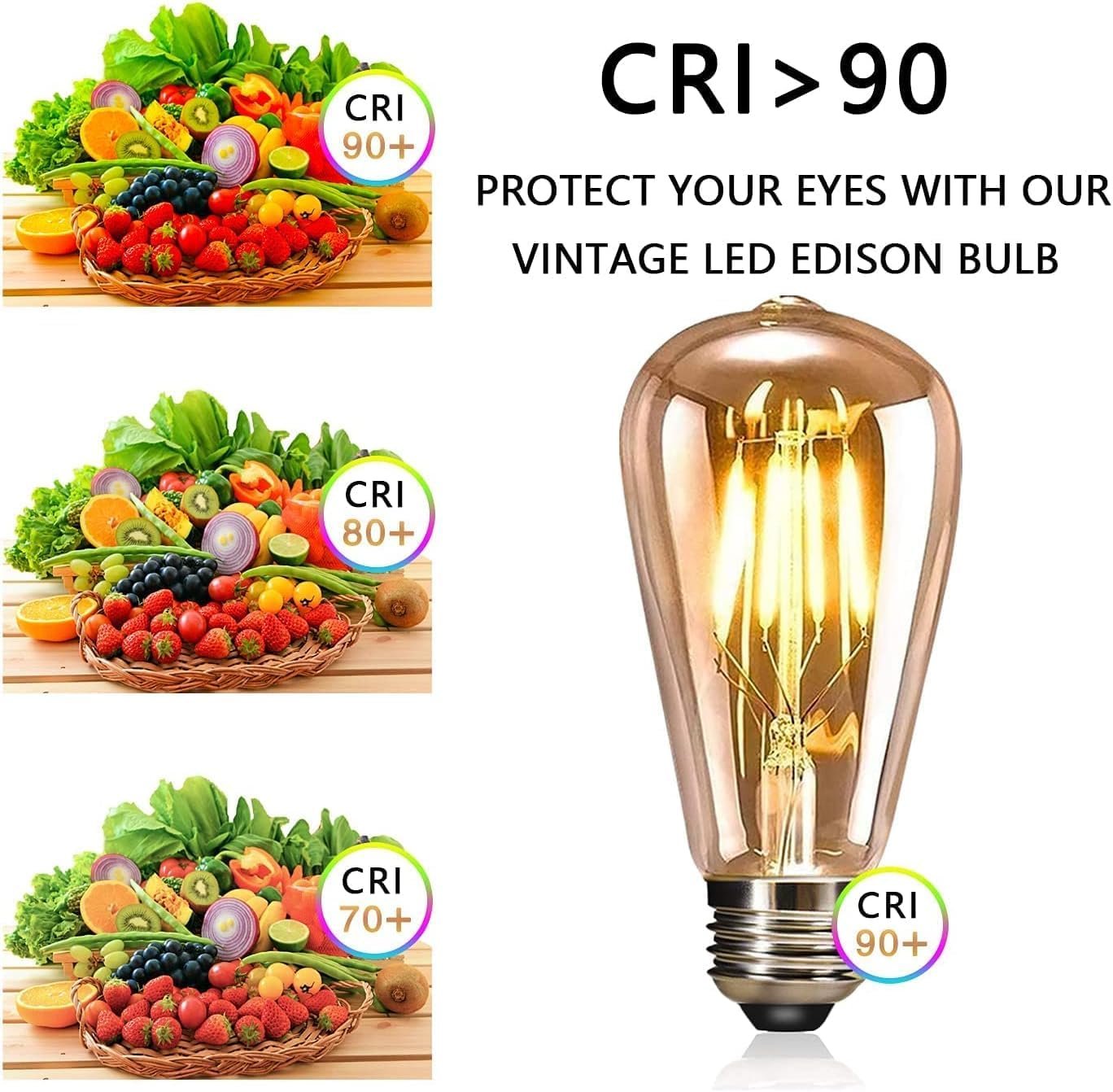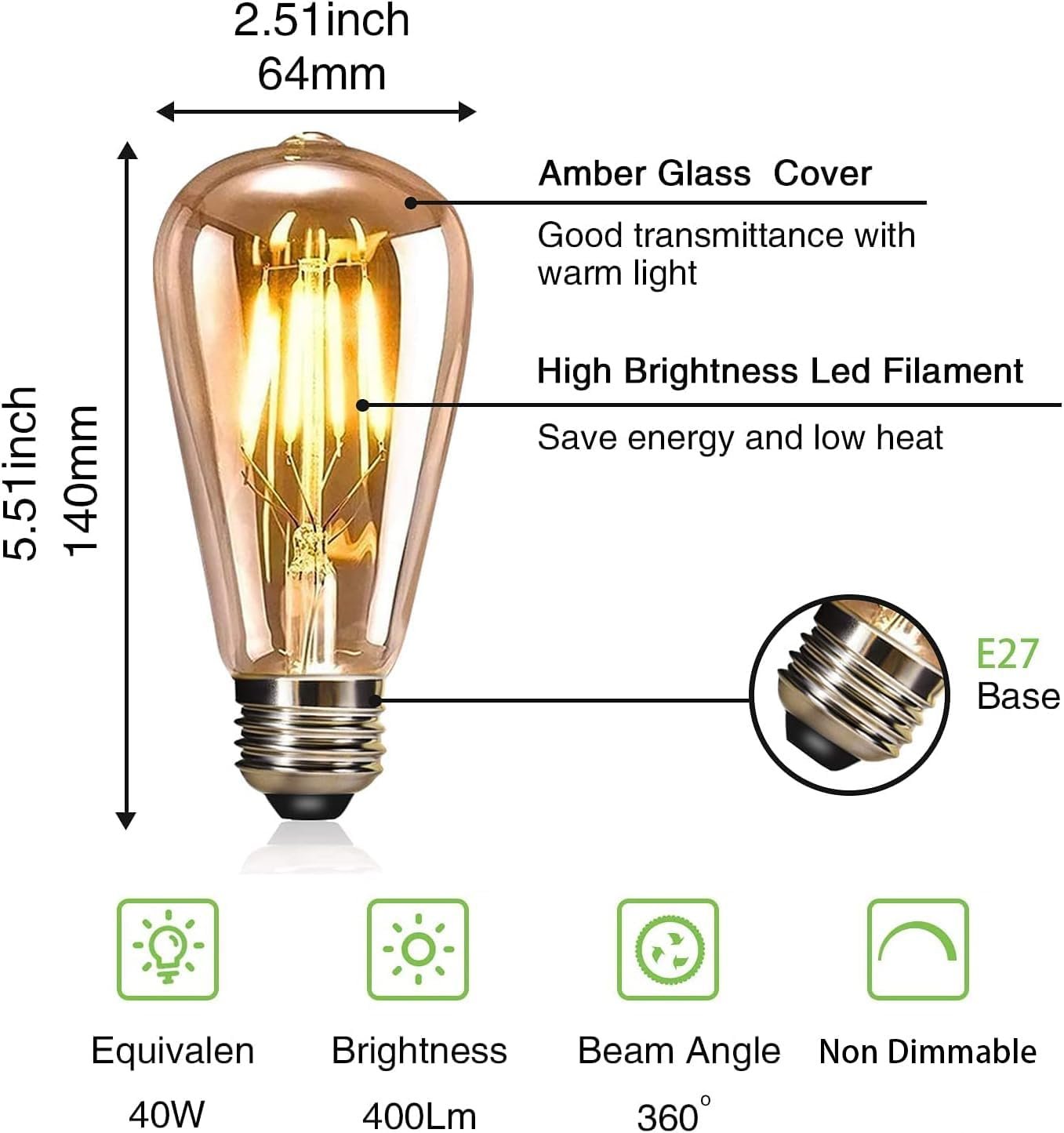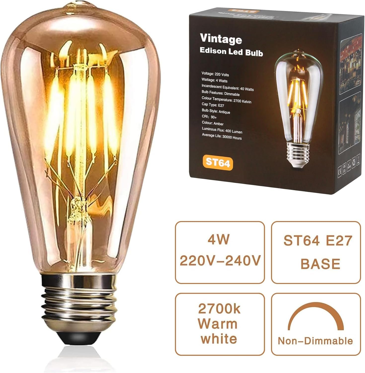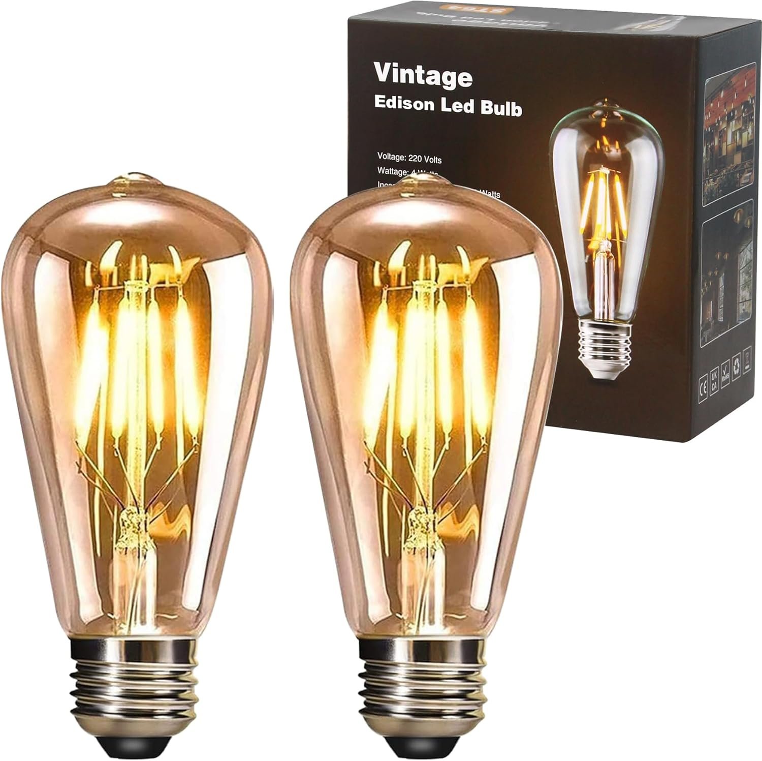 YOUDIAN LED Edison Bulb, Vintage Light Bulb,4W E27 2700K ST64 LED Bulbs, Led Filament Bulbs, Antique Style Retro Amber Glass Screw Lamp 220V (2 Packs)